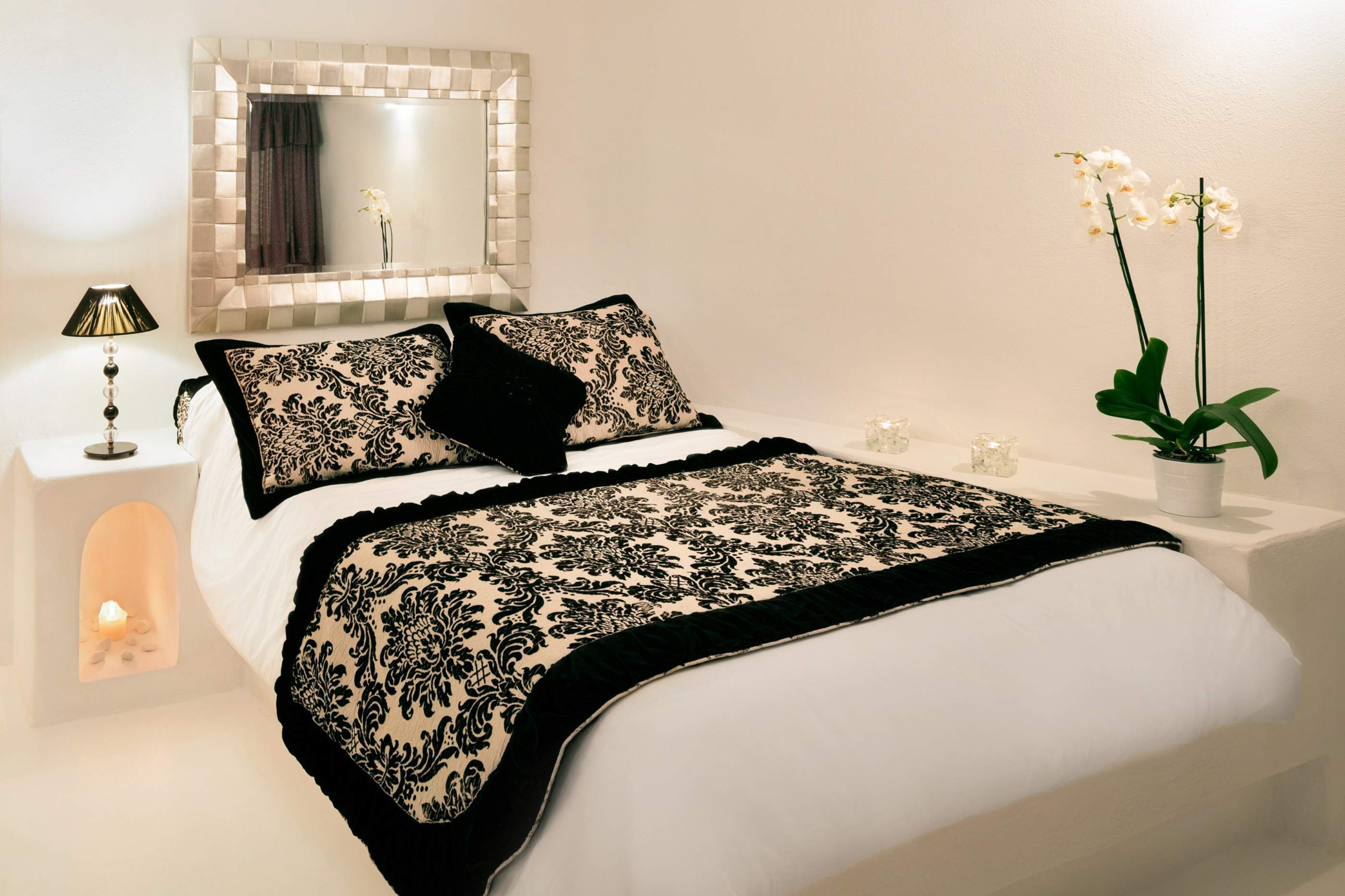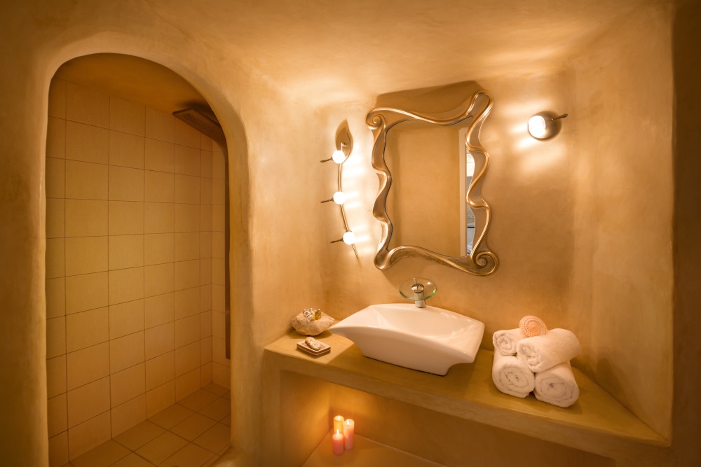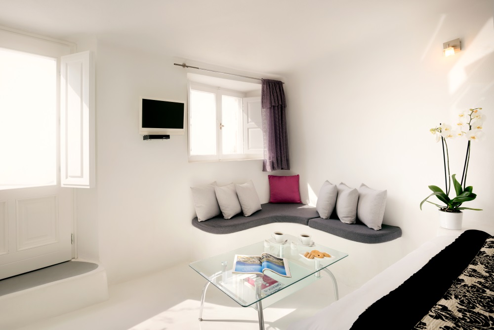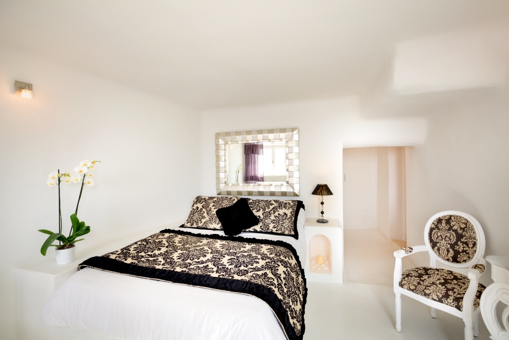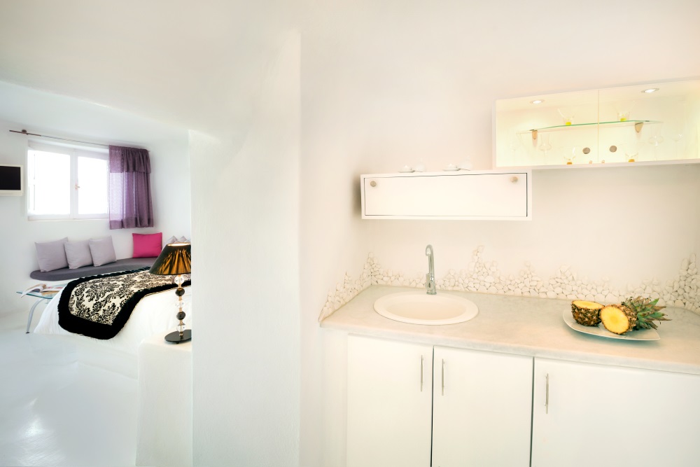 Our newly renovated cave suite, built in 2010, is modern and elegant with the design that combines traditional architecture with contemporary luxury. It has a built queen size double bed, a private balcony, a kitchenette and a beautiful bathroom with a built in shower.
