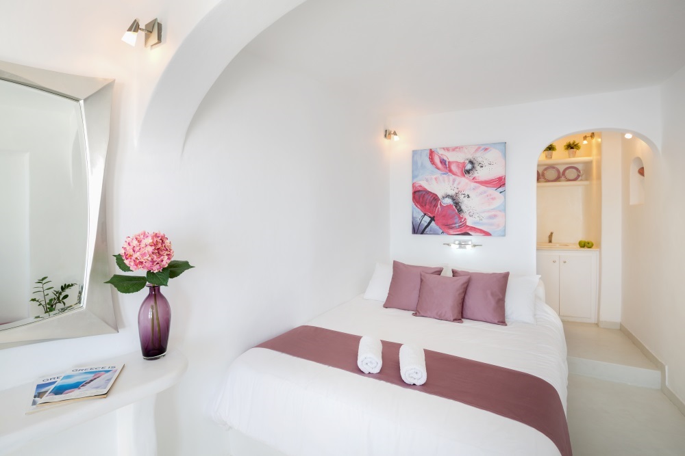 Studio include a bedroom with a steel or built queen size double bed, a kitchenette and a private bathroom with shower. The balcony have access to the hotel’s large patio with a small pool with view to the Caldera, the Aegean sea & the sunset.